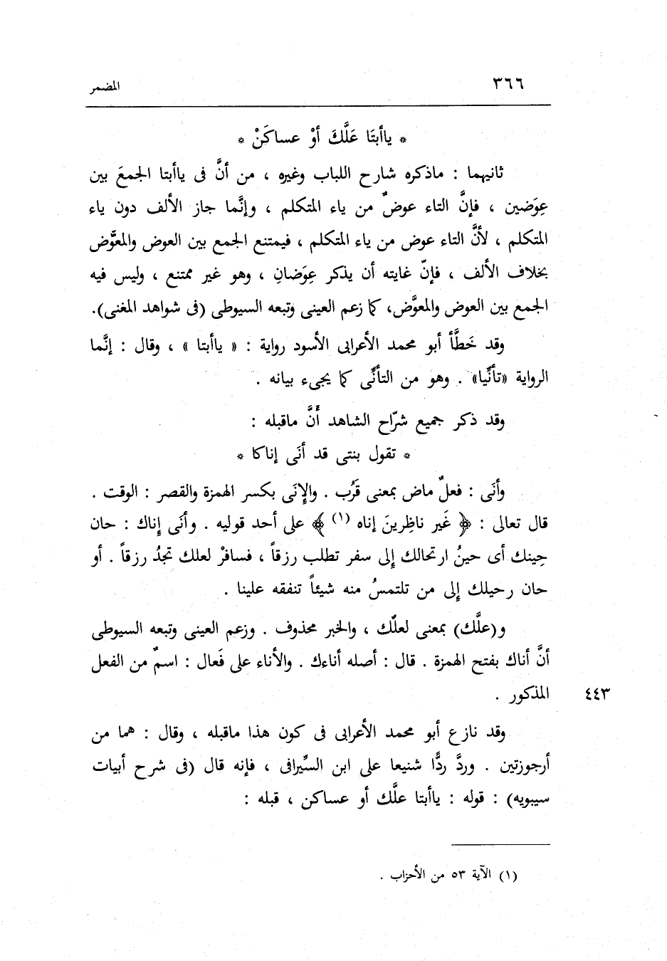 يَا أبتا علّك أَو عساكن ثَانِيهمَا: مَا ذكره شَارِح اللّبَاب وَغَيره من أَن فِي يَا أبتا الْجمع بَين عوضين قَالَ فَإِن التَّاء عوض من يَاء الْمُتَكَلّم وَإِنَّمَا جَازَ الْألف دون يَاء الْمُتَكَلّم لِأَن التَّاء عوض من يَاء التَّكَلُّم فَيمْتَنع الْجمع بَين الْعِوَض والمعوض بِخِلَاف الْألف فَإِن غَايَته أَن يذكر عوضان وَهُوَ غير مُمْتَنع وَلَيْسَ فِيهِ الْجمع بَين الْعِوَض والمعوض كَمَا زعم الْعَيْنِيّ وَتَبعهُ السُّيُوطِيّ فِي شَوَاهِد الْمُغنِي.