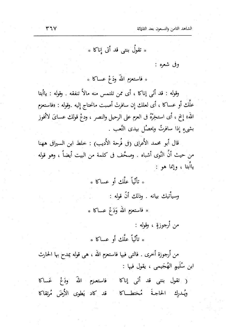 فاستعزم الله ودع عساكا من أرجوزة وَقَوله: تأنّياً علّك أَو عساكا من أرجوزة أُخْرَى. فالتي فِيهَا فاستعزم الله هِيَ قَوْله يمدح بهَا الْحَارِث بن سليم الهُجَيْمِي يَقُول فِيهَا: