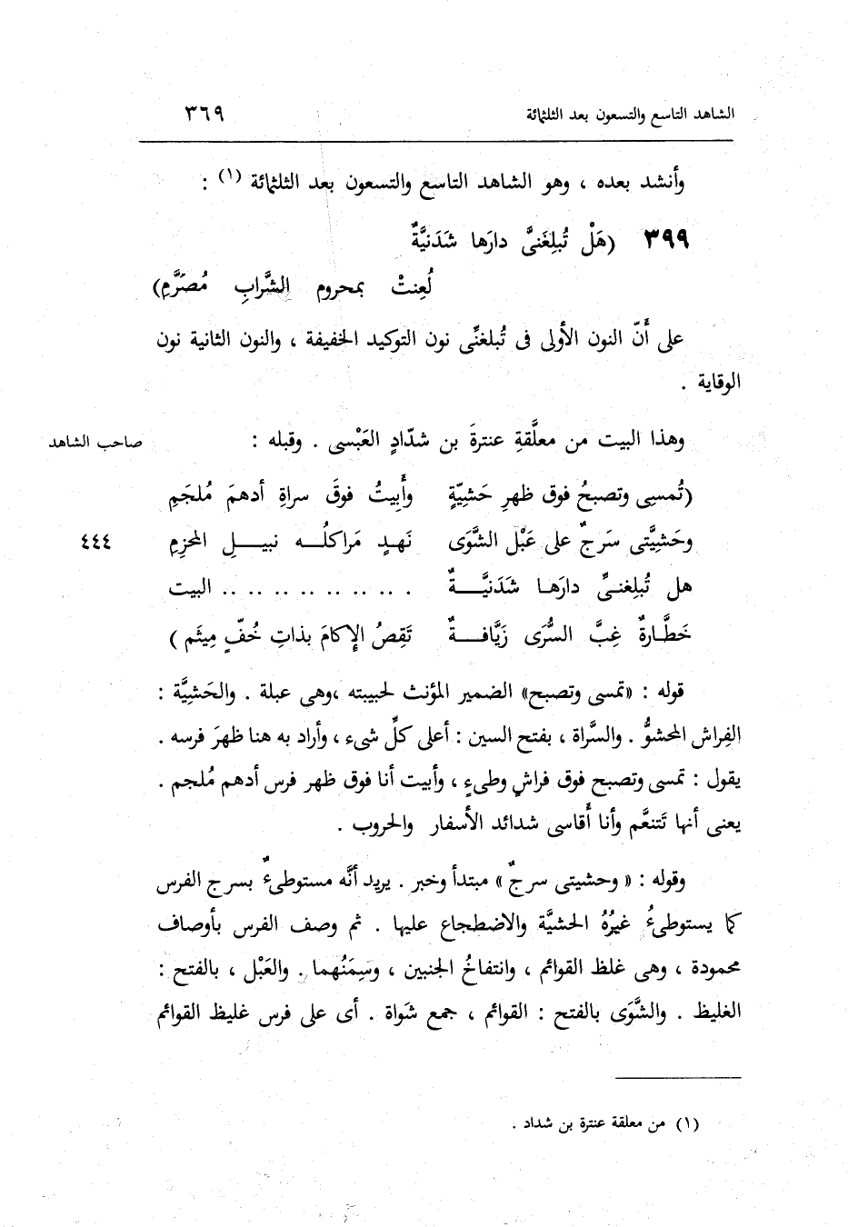 الْبَيْت قَوْله: تمسي وتصبح الضَّمِير الْمُؤَنَّث لحبيبته وَهِي عبلة. والحشية: الْفراش المحشو. والسراة بِفَتْح السِّين: أَعلَى كل شَيْء وَأَرَادَ بِهِ هُنَا ظهر فرسه. يَقُول: تمسي وتصبح فَوق فرَاش وطيء وأبيت أَنا فَوق ظهر فرس أدهم ملجم. يَعْنِي أَنَّهَا تتنعم وَأَنا أقاسي شَدَائِد الْأَسْفَار والحروب.
