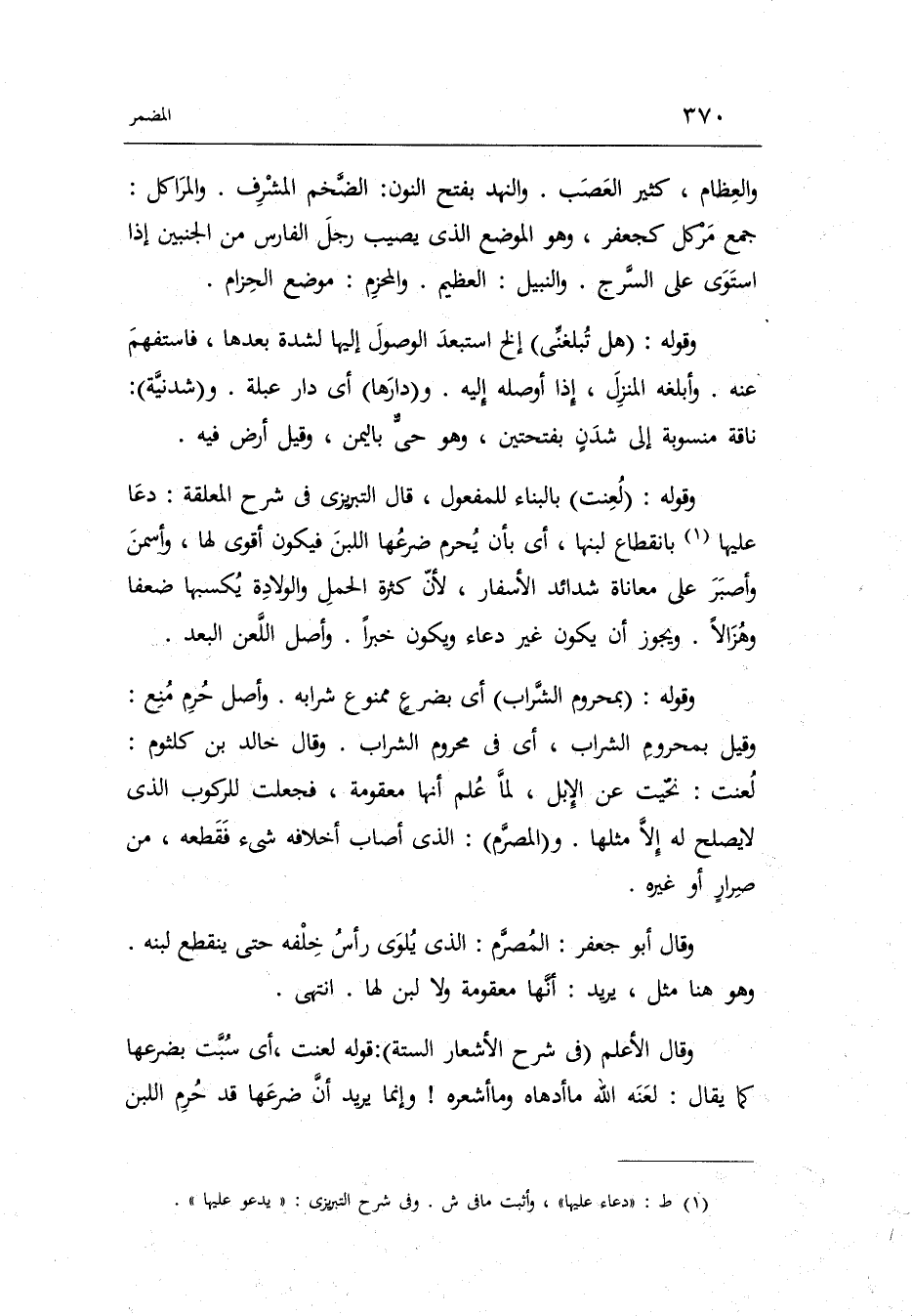 وَقَوله: لعنت بِالْبِنَاءِ للْمَفْعُول قَالَ التبريزي فِي شرح الْمُعَلقَة: دَعَا عَلَيْهَا بِانْقِطَاع لَبنهَا أَي: بِأَن يحرم ضرْعهَا اللَّبن فَيكون أقوى لَهَا وأسمن وأصبر على معاناة شَدَائِد الْأَسْفَار لِأَن كَثْرَة الْحمل وَقَوله: بمحروم الشَّرَاب أَي: بضرع مَمْنُوع شرابه. وأصل حرم منع. وَقيل: بمحروم الشَّرَاب أَي: فِي محروم الشَّرَاب. وَقَالَ خَالِد بن كُلْثُوم: لعنت: