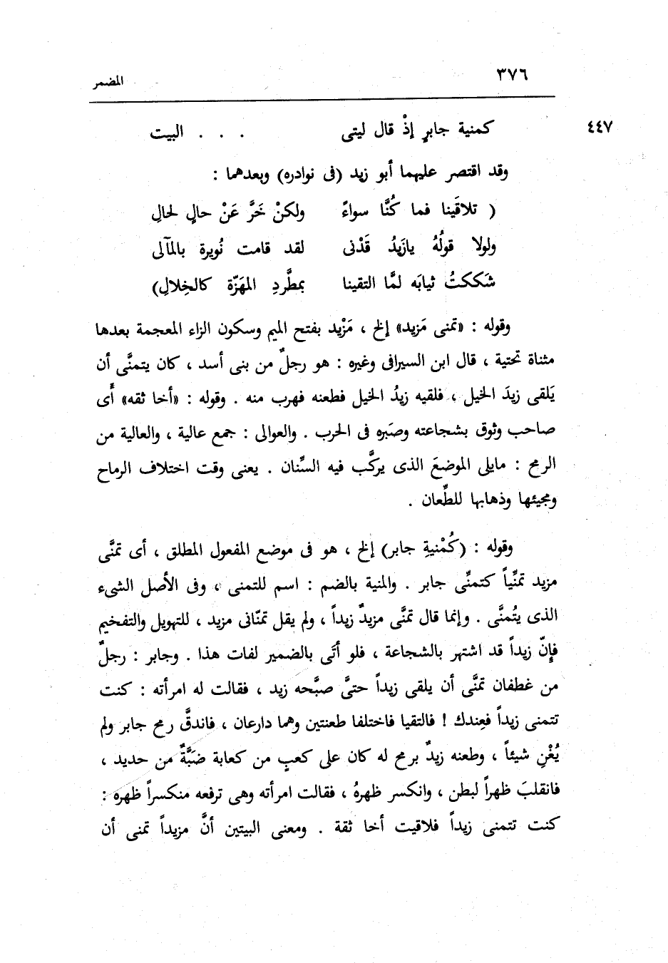وَقَوله: كمنية جَابر الخ هُوَ فِي مَوضِع الْمَفْعُول الْمُطلق أَي: تمنى مزِيد تمنياً كتمني جَابر. والمنية بِالضَّمِّ: اسْم لِلتَّمَنِّي وَفِي الأَصْل الشَّيْء الَّذِي يتَمَنَّى. وَإِنَّمَا قَالَ: تمنى مزِيد زيدا وَلم يقل: تمناني مزِيد للتهويل والتفخيم فَإِن زيدا قد اشْتهر بالشجاعة فَلَو أَتَى بالضمير لفات هَذَا.