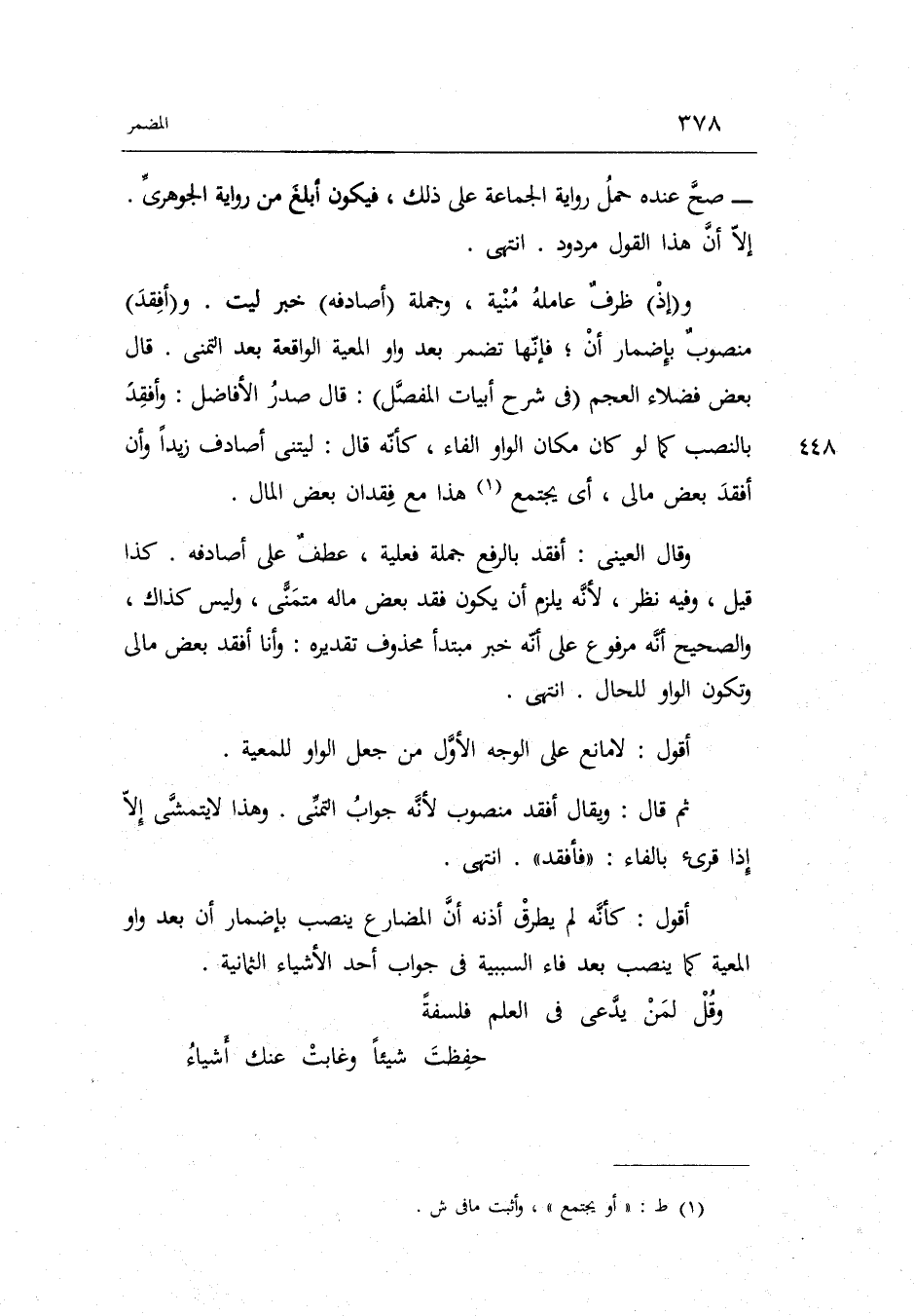 قَالَ بعض فضلاء الْعَجم فِي شرح أَبْيَات الْمفصل: قَالَ صدر الأفاضل: وأفقد بِالنّصب كَمَا لَو كَانَ مَكَان الْوَاو الْفَاء كَأَنَّهُ قَالَ: لَيْتَني أصادف زيدا وَأَن أفقد بعض مَالِي أَي: يجْتَمع هَذَا مَعَ فقدان بعض المَال.
