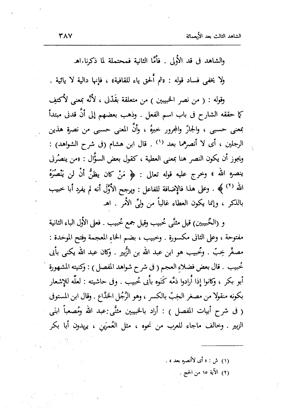 وَقَالَ ابْن المستوفي فِي شرح أَبْيَات الْمفصل: أَرَادَ بالخبيبين مثنى عبد الله ومصعباً ابْن الزبير.