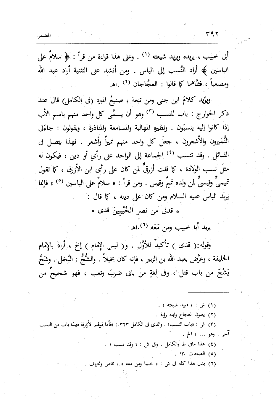 وَيُؤَيّد كَلَام ابْن جني وَمن تبعه صَنِيع الْمبرد فِي الْكَامِل قَالَ عِنْد ذكر الْخَوَارِج: بَاب للنسب وَهُوَ أَن يُسمى كل وَاحِد مِنْهُم باسم الْأَب إِذا كَانُوا إِلَيْهِ ينسبون. وَنَظِيره المهالبة والمسامعة والمناذرة وَيَقُولُونَ: جَاءَنِي النميرون والأشعرون جعل كل وَاحِد مِنْهُم نميراً وأشعر. فَهَذَا يتَّصل فِي الْقَبَائِل.