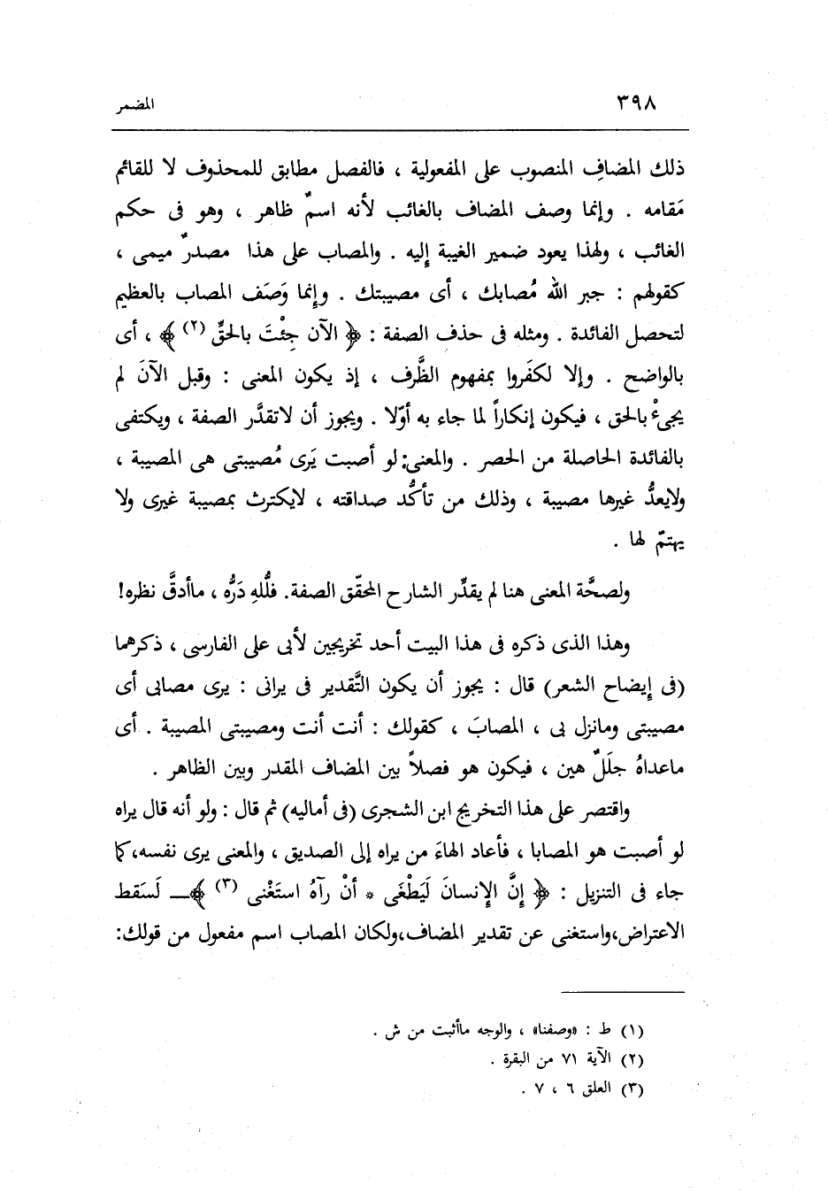 كَمَا جَاءَ فِي التَّنْزِيل: إنَّ الْإِنْسَان ليَطْغَى أنْ رآهُ استَغْنى لسقط الِاعْتِرَاض وَاسْتغْنى عَن تَقْدِير الْمُضَاف ولكان الْمُصَاب اسْم مفعول من قَوْلك: