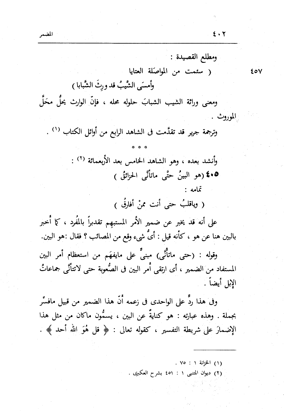 وَأنْشد بعده الشَّاهِد الْخَامِس بعد الأربعمائة: الطَّوِيل هُوَ الْبَيْت حتّى مَا تأنّى الحزائق