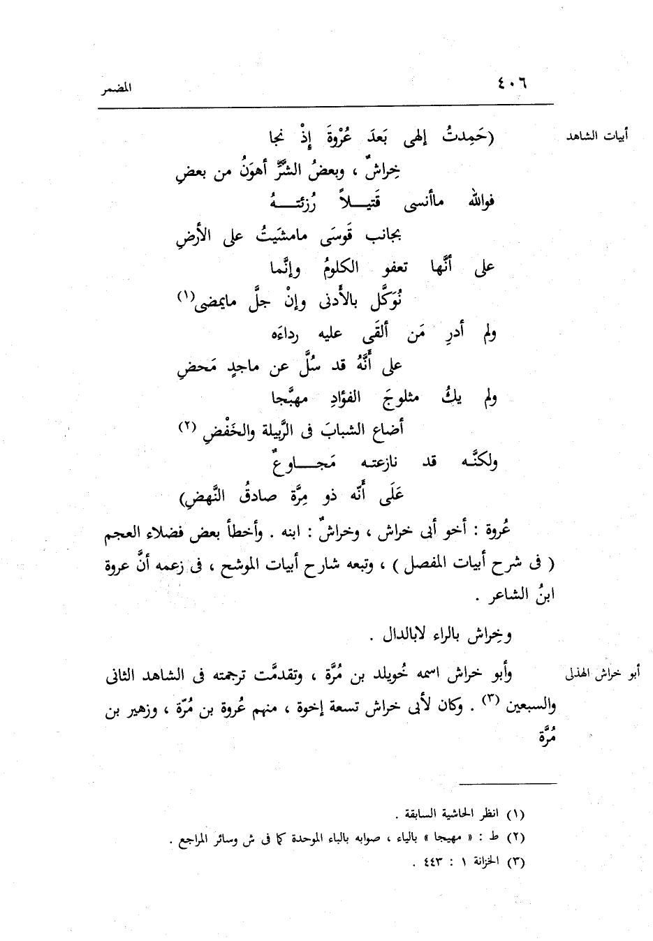 عُرْوَة: أَخُو أبي خرَاش وخراش: ابْنه. وَأَخْطَأ بعض فضلاء الْعَجم فِي شرح أَبْيَات الْمفصل)