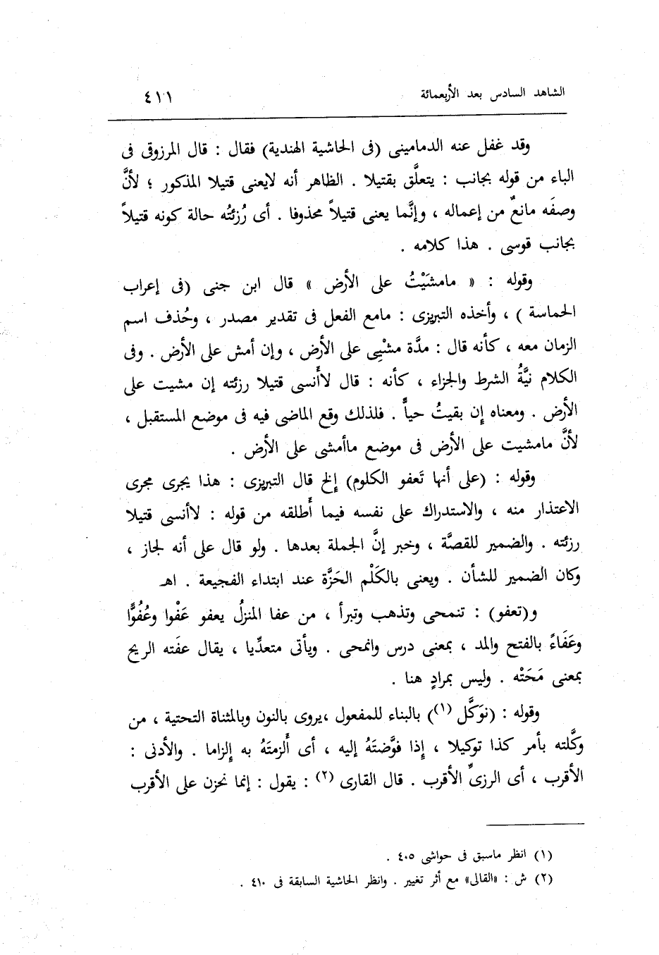 وَقَوله: مَا مشيت على الأَرْض قَالَ ابْن جني فِي إِعْرَاب الحماسة وَأَخذه التبريزي: مَا مَعَ الْفِعْل فِي تَقْدِير مصدر وَحذف اسْم الزَّمَان مَعَه كَأَنَّهُ قَالَ: مُدَّة مشي على الأَرْض وَإِن أمش على وَفِي الْكَلَام نِيَّة الشَّرْط وَالْجَزَاء. كَأَنَّهُ قَالَ: لَا أنسى قَتِيلا رزئته إِن مشيت على الأَرْض.