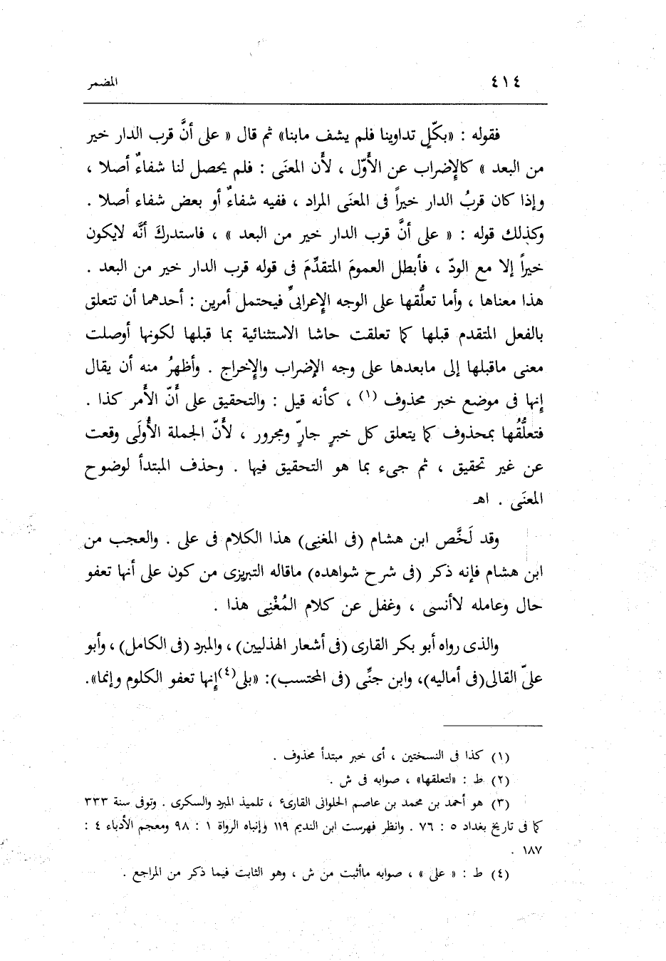 وَكَذَلِكَ قَوْله: على أَن قرب الدَّار خير من الْبعد فاستدرك أَنه لَا يكون خيرا إِلَّا مَعَ الود فَأبْطل الْعُمُوم الْمُتَقَدّم فِي قَوْله قرب الدَّار خير من الْبعد. هَذَا مَعْنَاهَا وَأما تعلقهَا على الْوَجْه الإعرابي فَيحْتَمل أَمريْن: أَحدهمَا: أَن تتَعَلَّق بِالْفِعْلِ الْمُتَقَدّم قبلهَا كَمَا تعلّقت حاشا الاستثنائية بِمَا قبلهَا لكَونهَا أوصلت معنى مَا قبلهَا إِلَى مَا بعْدهَا على وَجه الإضراب والإخراج. وَأظْهر مِنْهُ أَن يُقَال: إِنَّهَا فِي مَوضِع خبر مَحْذُوف الْمُبْتَدَأ كَأَنَّهُ قيل: وَالتَّحْقِيق على أَن الْأَمر كَذَا. فتعلقها بِمَحْذُوف كَمَا يتَعَلَّق كل خبر جَار ومجرور لِأَن الْجُمْلَة الأولى وَقعت عَن غير تَحْقِيق ثمَّ جِيءَ بِمَا هُوَ التَّحْقِيق فِيهَا وَحذف الْمُبْتَدَأ لوضوح الْمَعْنى. اه.