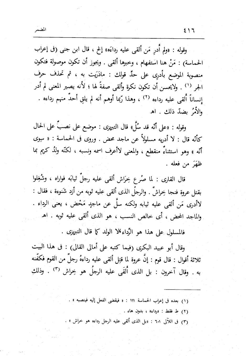 وَقَوله: وَلم أدر من ألْقى عَلَيْهِ رِدَاءَهُ الخ قَالَ ابْن جني: فِي إِعْرَاب الحماسة: من هُنَا اسْتِفْهَام وخبرها ألْقى. وَيجوز أَن تكون مَوْصُولَة