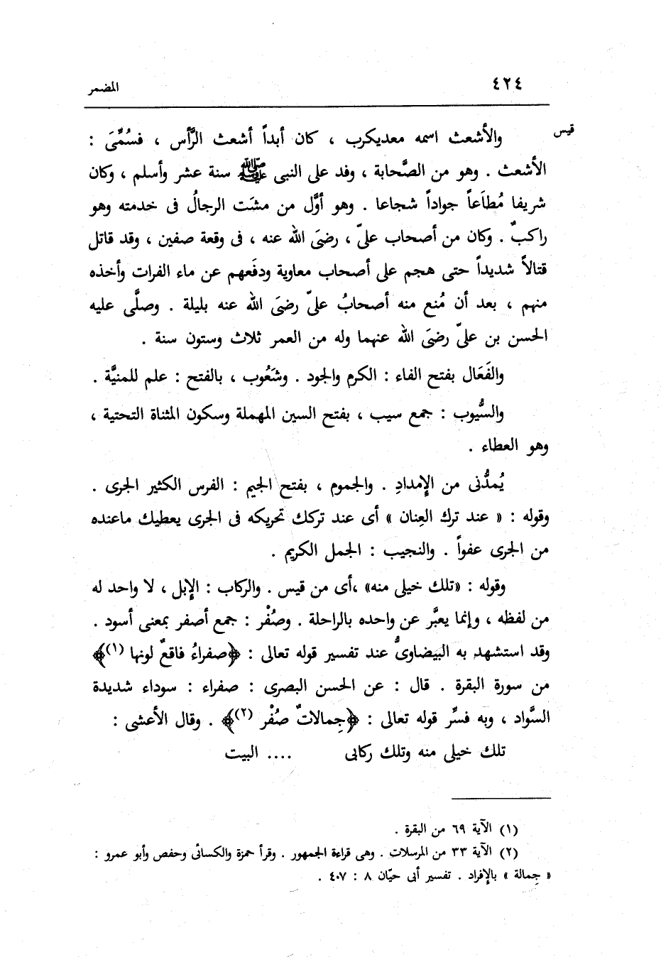 وَقد اسْتشْهد بِهِ الْبَيْضَاوِيّ عِنْد تَفْسِير قَوْله تَعَالَى: صفراءُ فاقعٌ لَوْنهَا من سُورَة الْبَقَرَة. قَالَ: عَن الْحسن الْبَصْرِيّ: صفراء: سَوْدَاء شَدِيدَة السوَاد وَبِه فسر قَوْله تَعَالَى: جِمالاتٌ صُفْر.
