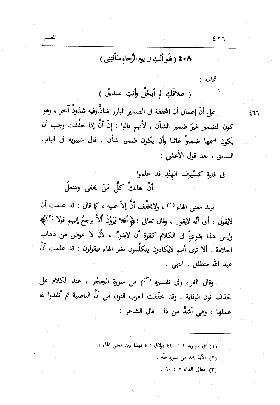 أَي: أَنه لَا يَقُول وَقَالَ تَعَالَى: أفَلا يَرَوْنَ ألاَّ يرجعُ إِلَيْهِم قولا وَلَيْسَ هَذَا بِقَوي فِي الْكَلَام كقوة أَن لَا يَقُول لِأَن لَا عوض من ذهَاب الْعَلامَة. أَلا ترى أَنهم لَا يكادون يَتَكَلَّمُونَ بِغَيْر الْهَاء فَيَقُولُونَ قد علمت أَن عبد الله منطلق. انْتهى.