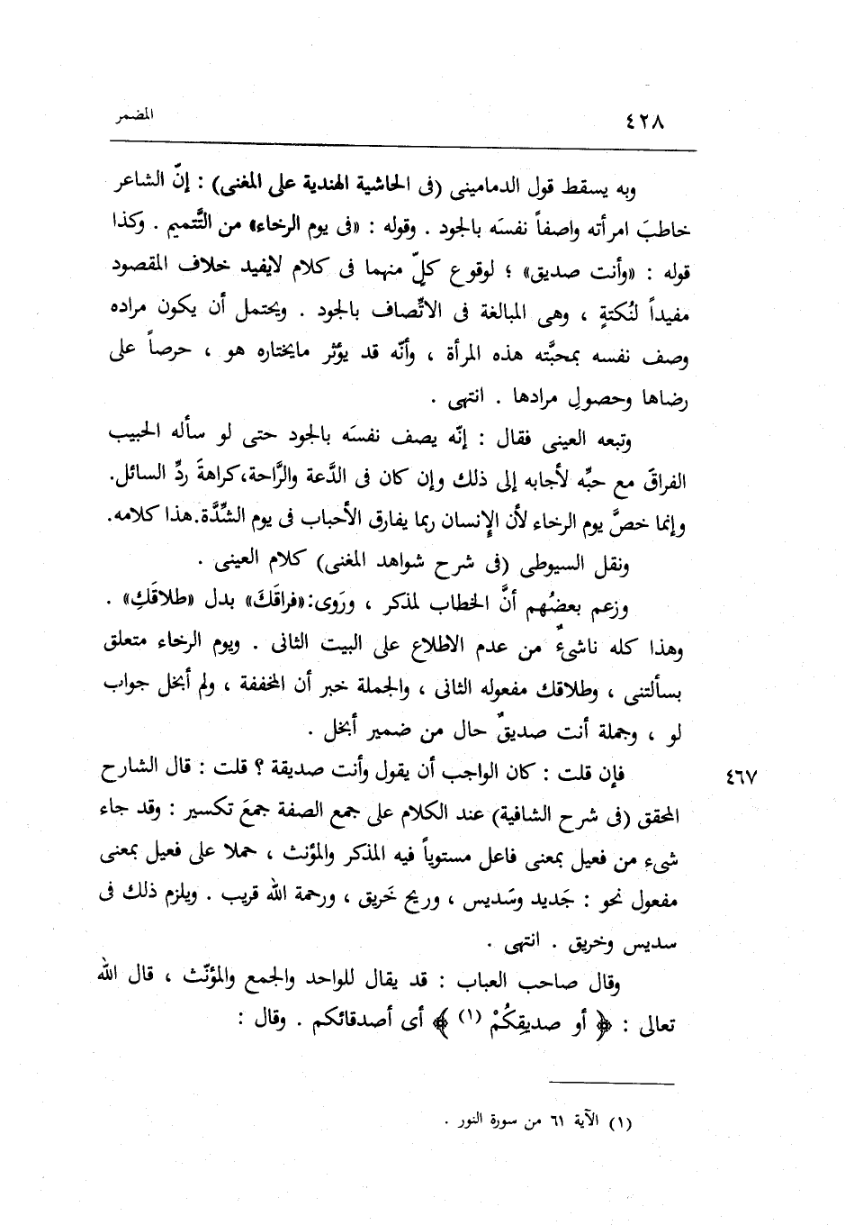 وَزعم بَعضهم أَن الْخطاب لمذكر وروى: فراقك بدل: طَلَاقك. وَهَذَا كُله نَاشِئ من عدم الِاطِّلَاع على الْبَيْت الثَّانِي. وَيَوْم الرخَاء مُتَعَلق بسألتني وطلاقك مَفْعُوله الثَّانِي وَالْجُمْلَة خبر أَن المخففة وَلم أبخل جَوَاب لَو وَجُمْلَة: أَنْت صديق حَال من ضمير أبخل.