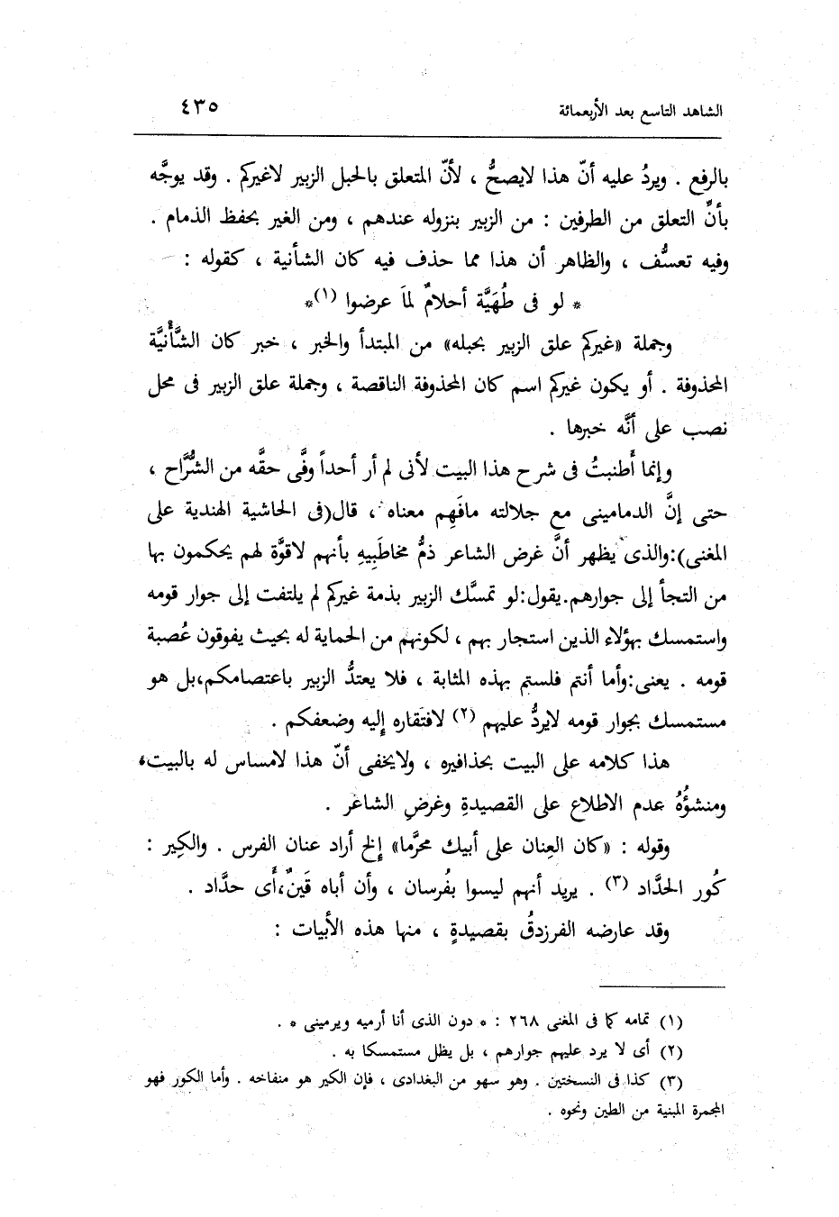 وَإِنَّمَا أطنبت فِي شرح هَذَا الْبَيْت لِأَنِّي لم أر أحدا وَفِي حَقه من الشُّرَّاح حَتَّى إِن الدماميني مَعَ جلالته مَا فهم مَعْنَاهُ قَالَ فِي الْحَاشِيَة الْهِنْدِيَّة على الْمُغنِي: وَالَّذِي يظْهر أَن غَرَض الشَّاعِر ذمّ مخاطبيه بِأَنَّهُم لَا قُوَّة لَهُم يحكمون بهَا من التجأ إِلَى جوارهم.
