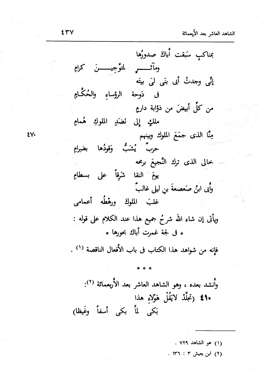 وَأنْشد بعده الشَّاهِد الْعَاشِر بعد الأربعمائة الوافر