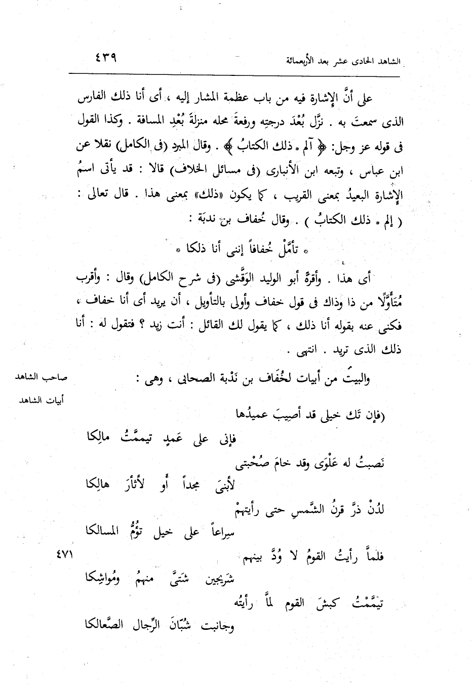 تأمّل خفافاً إنّني أَنا ذلكا أَي: هَذَا. وَأقرهُ أَبُو الْوَلِيد الْقرشِي فِي شرح الْكَامِل وَقَالَ: وَأقرب متأوّلاً من ذَا وَذَاكَ فِي قَول خفاف وَأولى بالتأويل أَن يُرِيد أَي: أَنا خفاف فكنى عَنهُ بقوله أَنا ذَلِك كَمَا يَقُول لَك الْقَائِل: أَنْت زيد فَتَقول لَهُ: أَنا ذَلِك الَّذِي تُرِيدُ. انْتهى.