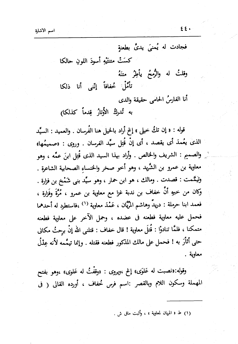 وَأَرَادَ بِهَذَا السَّيِّد الَّذِي قتل ابْن عَمه وَهُوَ مُعَاوِيَة بن عَمْرو بن الشريد وَهُوَ أَخُو صَخْر والخنساء الصحابية الشاعرة. وتيممت: قصدت. وَمَالك هُوَ ابْن حمَار. وَهُوَ سيد بني شمخ بن فَزَارَة.)