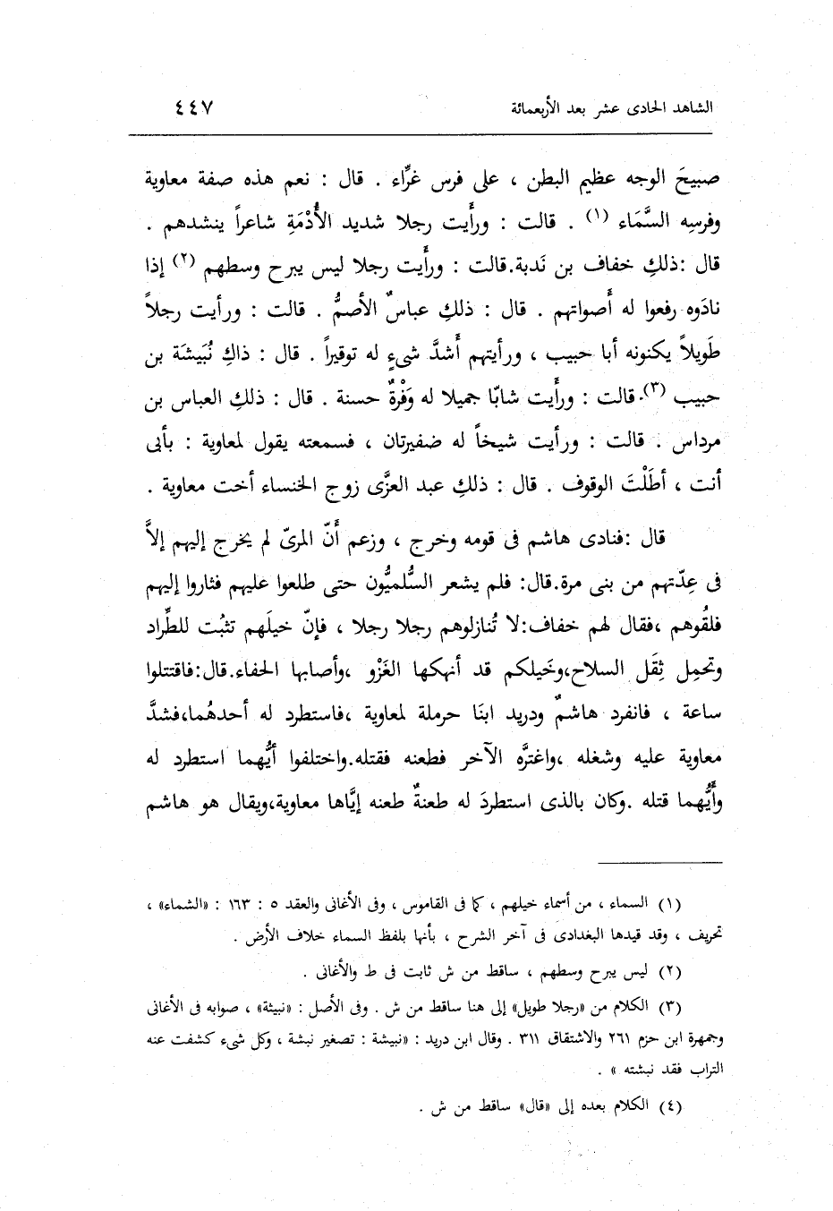 قَالَت: وَرَأَيْت شَابًّا جميلاً لَهُ وفرة حنسة. قَالَ: ذَلِك الْعَبَّاس بن مرداس.