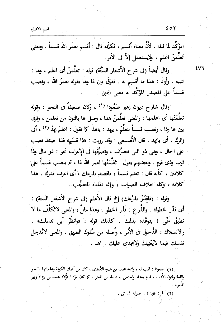 وَقَالَ شَارِح ديوَان زُهَيْر صعُودًا وَكَانَ ضَعِيفا فِي النَّحْو: وَقَوله تعلمنها أَي: اعلمها وَالْمعْنَى تعلمن هَذَا وصل هَا بالنُّون من تعلمن وَفرق بَين هَا وَذَا وَنصب قسما بتَعَلُّم يُرِيد: يَا هَذَا كَمَا تَقول: اعْلَم زيد أَنِّي زائرك أَي: يَا زيد.