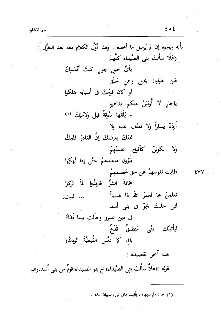 هَذَا آخر القصيدة: قَوْله: هلا سَأَلت بني الصيداء الخ بَنو الصيداء: قوم من بني أَسد وهم