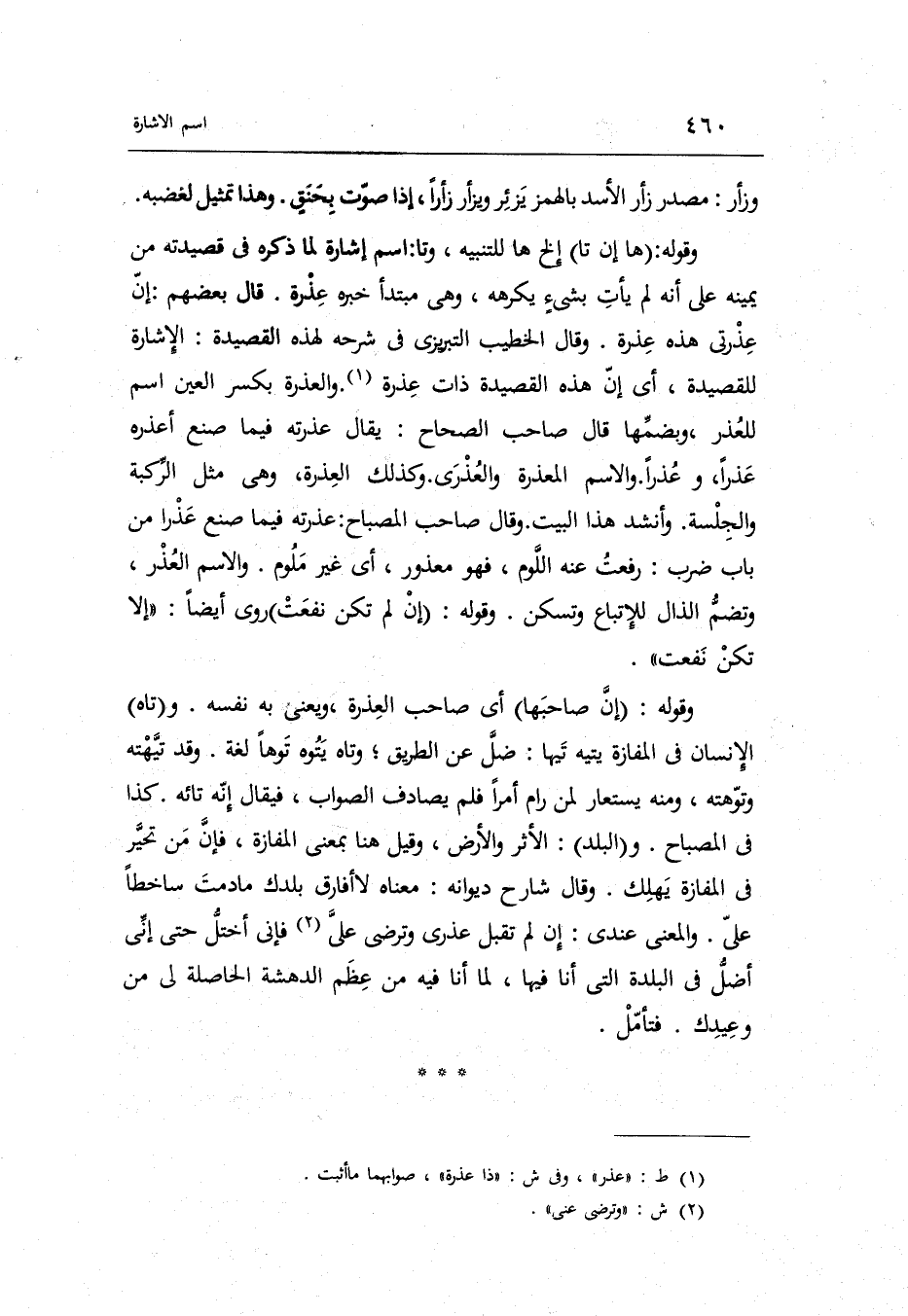 وَقَوله: هَا إِن تا الخ هَا للتّنْبِيه وتا: اسْم إِشَارَة لما ذكره فِي قصيدته من يَمِينه على أَنه لم يَأْتِ بِشَيْء يكرههُ. وَهِي مُبْتَدأ خَبره عذرة. وَقَالَ بَعضهم: إِن عذرتي هَذِه عذرة.