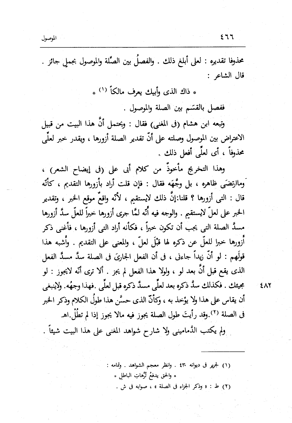 وَتَبعهُ ابْن هِشَام فِي الْمُغنِي فَقَالَ: ويحتم أَن هَذَا الْبَيْت من قبيل الِاعْتِرَاض بَين الْمَوْصُول وصلته على أَن تَقْدِير الصِّلَة أزورها وَيقدر خبر لعَلي محذوفاً أَي: لعَلي أفعل ذَلِك.