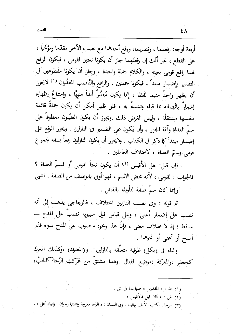 ثمَّ قَوْله: وَفِي نصب النازلين اخْتِلَاف فالزجاجي يذهب إِلَى أَنه نصب على إِضْمَار أَعنِي وعَلى قِيَاس قَول سِيبَوَيْهٍ نصب على الْمَدْح سَاقِط إِذْ لَا اخْتِلَاف معنى فَإِن هَذَا وَنَحْوه مَنْصُوب على الْمَدْح سَوَاء قدر أمدح أَو أَعنِي أَو نَحْوهمَا.