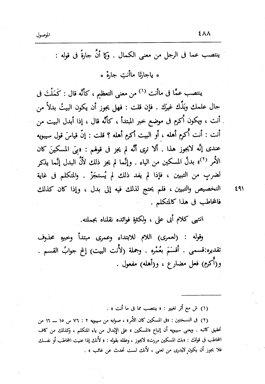 والمتكلم فِي غَايَة التَّخْصِيص والتبيين فَلم يحْتَج لذَلِك فِيهِ إِلَى بدل وَإِذا كَانَ كَذَلِك فالمخاطب فِي هَذَا كالمتكلم. انْتهى كَلَام أبي عَليّ ولكثرة فَوَائده نَقَلْنَاهُ بجملته.