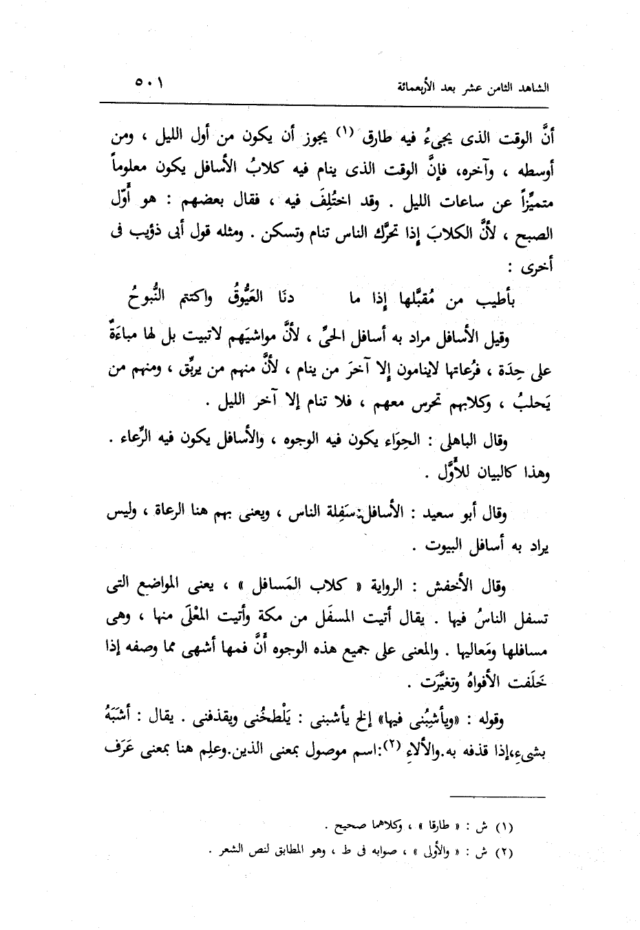 أَن الْوَقْت الَّذِي يَجِيء فِيهِ طَارق يجوز أَن يكون من أول اللَّيْل وَمن أوسطه وَآخره فَإِن الْوَقْت الَّذِي ينَام فِيهِ كلاب الأسافل يكون مَعْلُوما متميزاً عَن سَاعَات اللَّيْل.