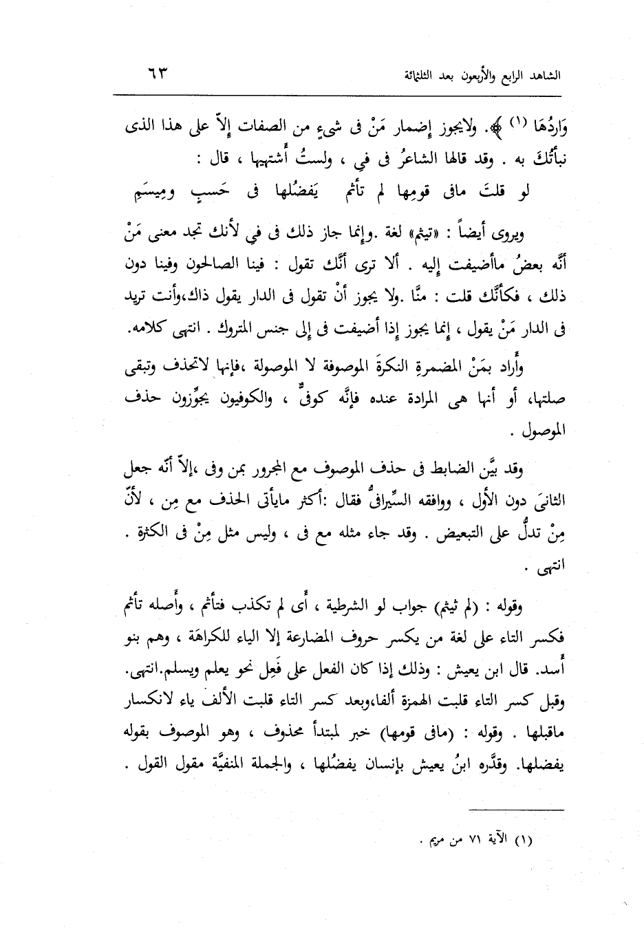 أَلا ترى أَنَّك تَقول فِينَا الصالحون وَفينَا دون ذَلِك فكأنك: قلت منا. وَلَا يجوز أَن تَقول فِي الدَّار يَقُول ذَاك وَأَنت تُرِيدُ فِي الدَّار من يَقُول إِنَّمَا يجوز إِذا أضيفت فِي إِلَى جنس الْمَتْرُوك.