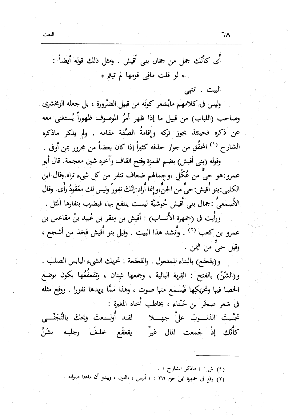 وَلَيْسَ فِي كَلَامهم مَا يشْعر كَونه من قبل الضَّرُورَة بل جعله الزَّمَخْشَرِيّ وَصَاحب اللّبَاب من قبل مَا إِذا ظهر أَمر الْمَوْصُوف ظهوراً يسْتَغْنى مَعَه عَن ذكره فَحِينَئِذٍ يجوز تَركه وَإِقَامَة الصّفة مقَامه. وَلم يذكر مَا ذكره الشَّارِح الْمُحَقق من جَوَاز حذفه كثيرا إِذا كَانَ بَعْضًا من مجرور بِمن أَو وَقَوله: بني أقيش بِضَم الْهمزَة وَفتح الْقَاف وَآخره شين مُعْجمَة. قَالَ أَبُو عَمْرو: هُوَ حَيّ من عكل وجمالهم ضِعَاف تنفر من كل شَيْء ترَاهُ.