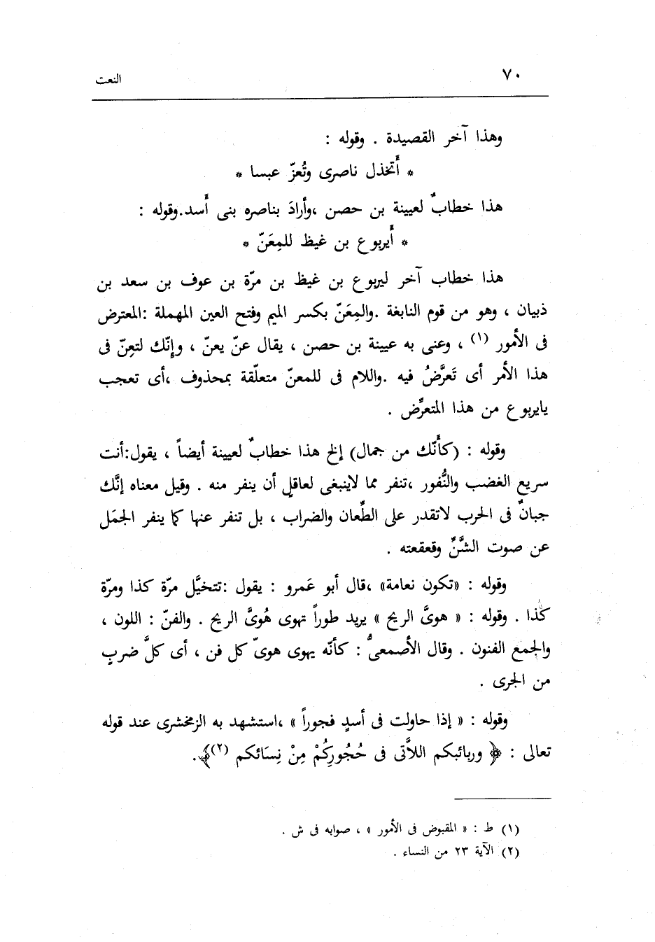 وَقَوله: هوي الرّيح يُرِيد طوراً تهوي هوي الرّيح. والفن: اللَّوْن وَالْجمع الْفُنُون. وَقَالَ الْأَصْمَعِي: وَقَوله: إِذا حاولت فِي أَسد فجوراً اسْتشْهد بِهِ الزَّمَخْشَرِيّ عِنْد قَوْله تَعَالَى: وربائبك اللاَّتي فِي جُحورِكُمْ مِنْ نِسَائكم.