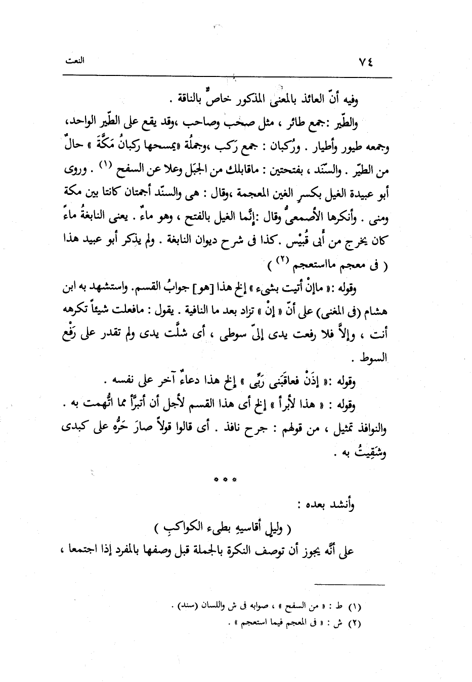 وَأنْشد بعده: وليلٍ أقاسه بطيء الْكَوَاكِب على أَنه يجوز أَن تُوصَف النكرَة بِالْجُمْلَةِ قبل وصفهَا بالمفرد إِذا اجْتمعَا