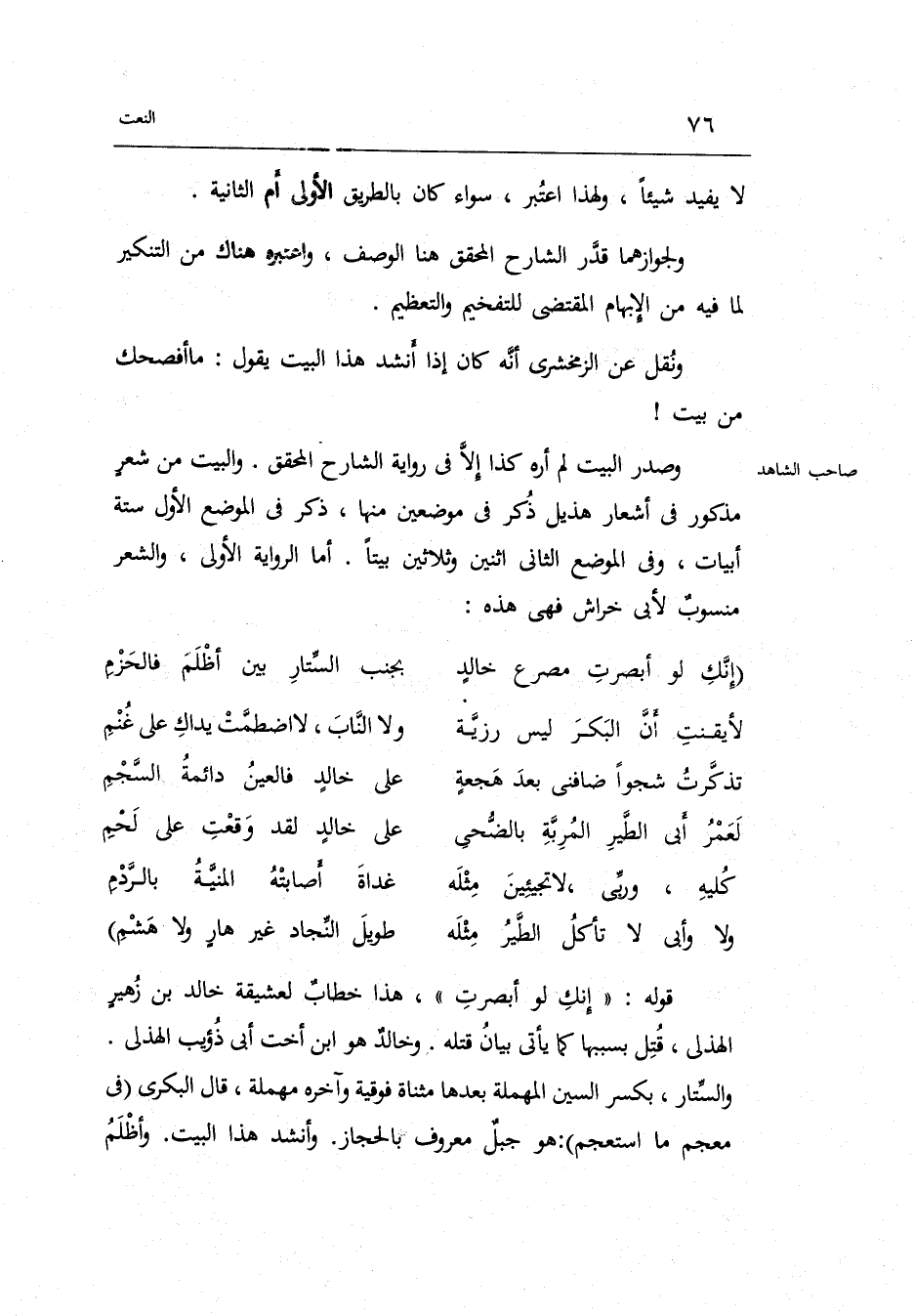 وَنقل عَن الزَّمَخْشَرِيّ أَنه كَانَ إِذا أنْشد هَذَا الْبَيْت يَقُول: مَا أفصحك من بَيت وَصدر الْبَيْت لم أره كَذَا إِلَّا فِي رِوَايَة الشَّارِح الْمُحَقق. وَالْبَيْت من شعر مَذْكُور فِي أشعار هُذَيْل ذكر فِي موضِعين مِنْهَا ذكر فِي الْموضع الأول سِتَّة أَبْيَات وَفِي الْموضع الثَّانِي اثْنَيْنِ وَثَلَاثِينَ بَيْتا. أما الرِّوَايَة الأولى وَالشعر مَنْسُوب لأبي خرَاش فَهِيَ هَذِه: