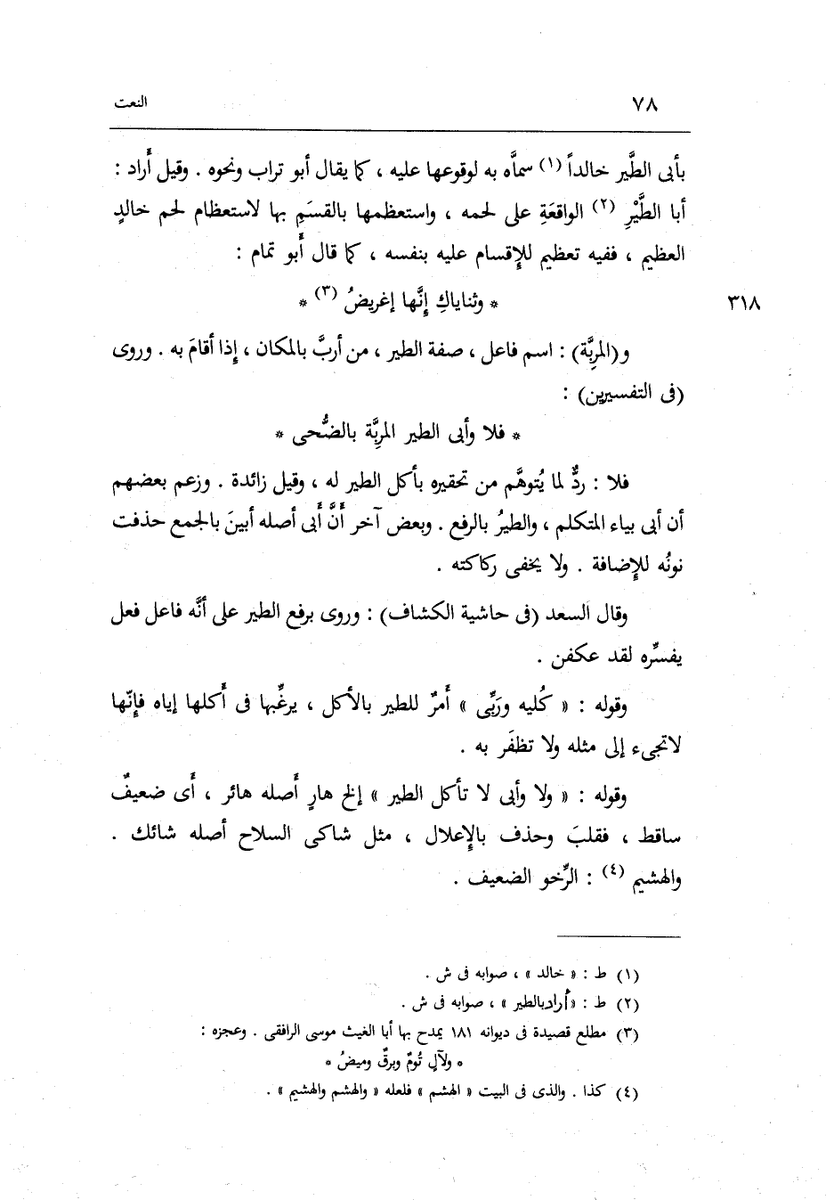 بِأبي الطير الْوَاقِعَة على لَحْمه واستعظمها بالقسم بهَا لاستعظام لحم خَالِد الْعَظِيم فَفِيهِ تَعْظِيم للإقسام عَلَيْهِ بِنَفسِهِ كَمَا قَالَ أَبُو تَمام: وثناياك إنّها إغريض والمربة: اسْم فَاعل صفة للطير من أرب بِالْمَكَانِ إِذا أَقَامَ بِهِ. وَرُوِيَ فِي التفسيرين: فَلَا وَأبي الطير المربة بالضحى فَلَا رد لما يتَوَهَّم من تحقيره بِأَكْل الطير لَهُ وَقيل زَائِدَة. وَزعم بَعضهم أَن أبي بياء الْمُتَكَلّم وَالطير بِالرَّفْع. وَبَعض آخر لِأَن أبي أَصله أبين بِالْجمعِ حذفت نونه للإضافة. وَلَا يخفى ركاكته.