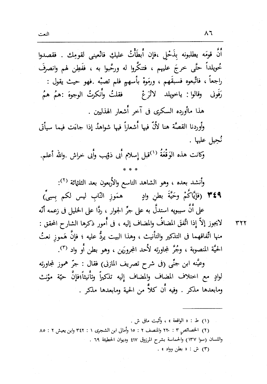 التَّذْكِير والتأنيث وَهَذَا الْبَيْت يرد عَلَيْهِ فَإِن هموز نعت الْحَيَّة المنصوبة. وجر لمجاورته لأحد المجرورين وَهُوَ بطن أَو وَاد.