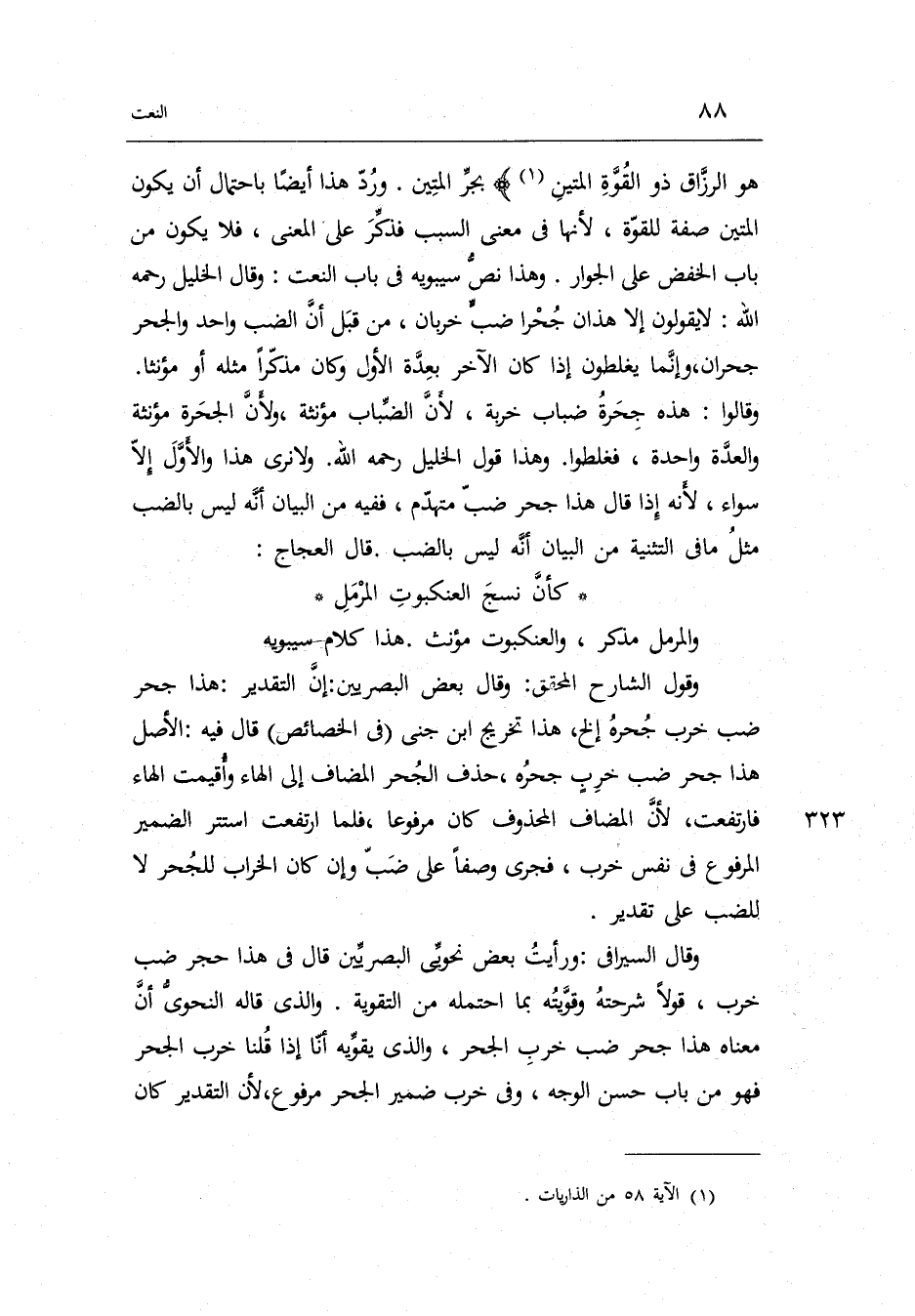 وَقَالَ السيرافي: وَرَأَيْت بعض نَحْويي الْبَصرِيين قَالَ فِي هَذَا جُحر ضَب خرب قولا شرحته وقويته بِمَا احتمله من التقوية.