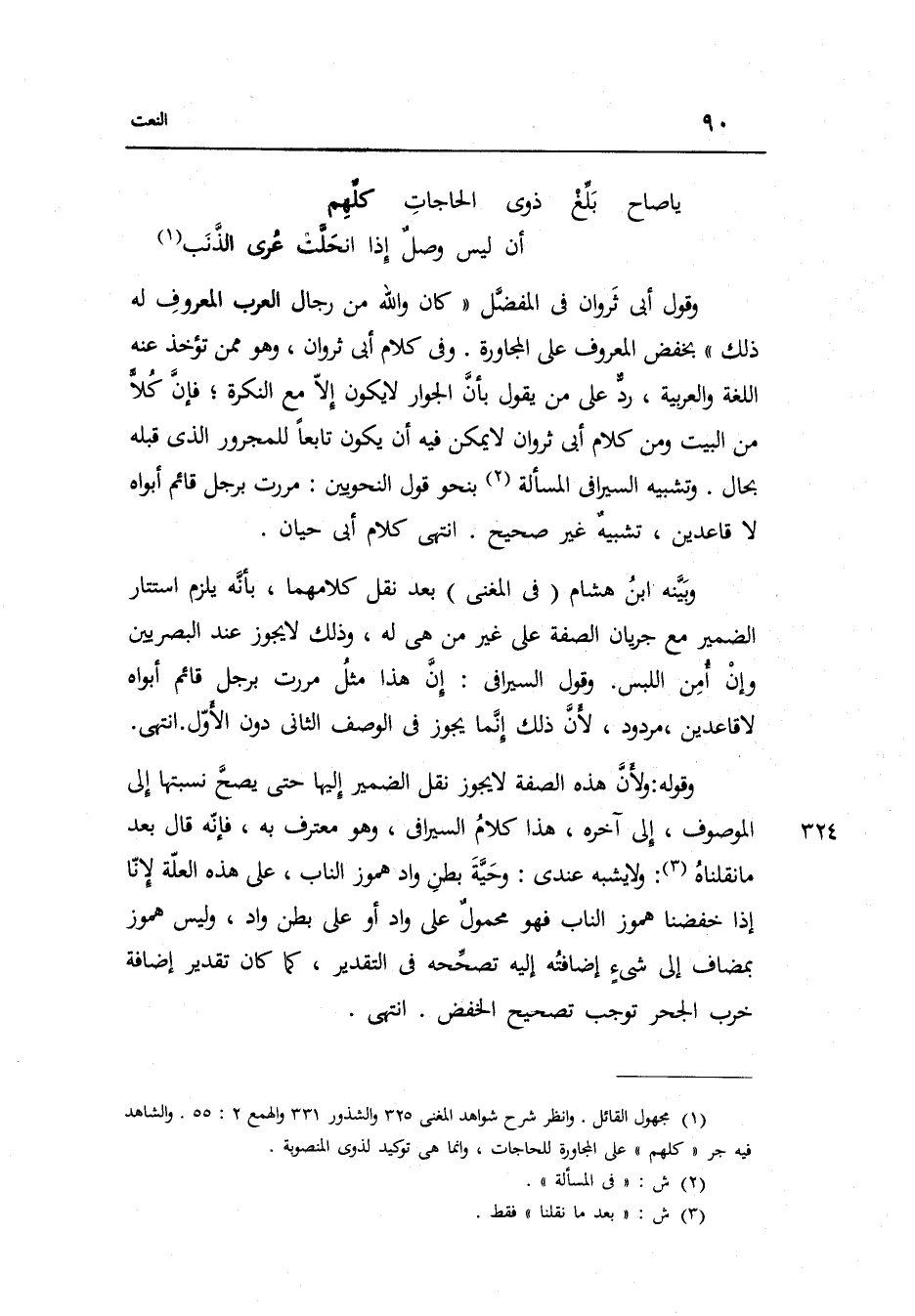 وَقَول أبي ثروان فِي الْمفضل كَانَ وَالله من رجال الْعَرَب الْمَعْرُوف لَهُ ذَلِك بخفض الْمَعْرُوف على الْمُجَاورَة. وَفِي كَلَام أبي ثروان وَهُوَ مِمَّن تُؤْخَذ عَنهُ اللُّغَة والعربية رد على من يَقُول بِأَن الْجوَار لَا يكون إِلَّا مَعَ النكرَة فَإِن كلا من الْبَيْت وَمن كَلَام أبي ثروان لَا يُمكن فِيهِ أَن يكون تَابعا للمجرور الَّذِي قبله بِحَال.