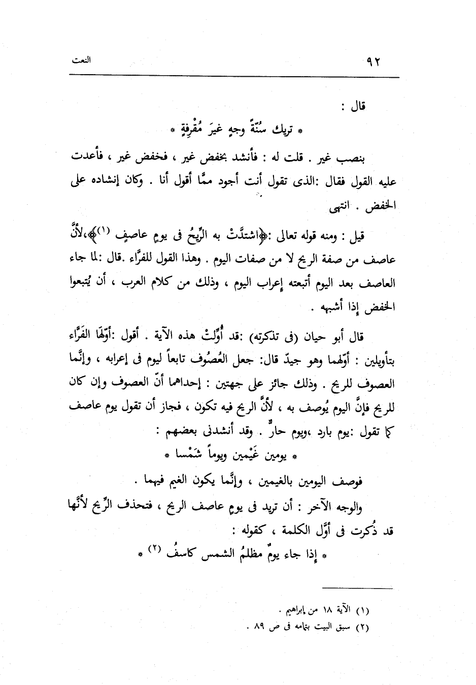 قَالَ: تريك سنّة وجهٍ غير مقرفةٍ بِنصب غير. قلت لَهُ: فَأَنْشد بخفض غير فخفض غير فَأَعَدْت عَلَيْهِ القَوْل فَقَالَ: الَّذِي تَقول قيل: وَمِنْه قَوْله تَعَالَى: اشتدَّتْ بِهِ الريحُ فِي يومٍ عاصفٍ لِأَن عاصف من صفة الرّيح لَا من صِفَات الْيَوْم. وَهَذَا القَوْل للفراء. قَالَ: لما جَاءَ العاصف بعد الْيَوْم أتبعته إِعْرَاب الْيَوْم وَذَلِكَ من كَلَام الْعَرَب أَن يتبعوا الْخَفْض الْخَفْض إِذا أشبهه.
