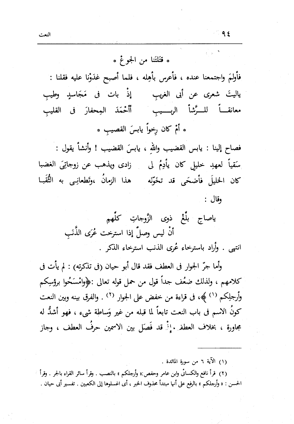 جدا قَول من حمل قَوْله تَعَالَى: وامْسَحُوا برؤُوسِكُمْ وأرجِلكم فِي قِرَاءَة من خفض على الْجوَار.