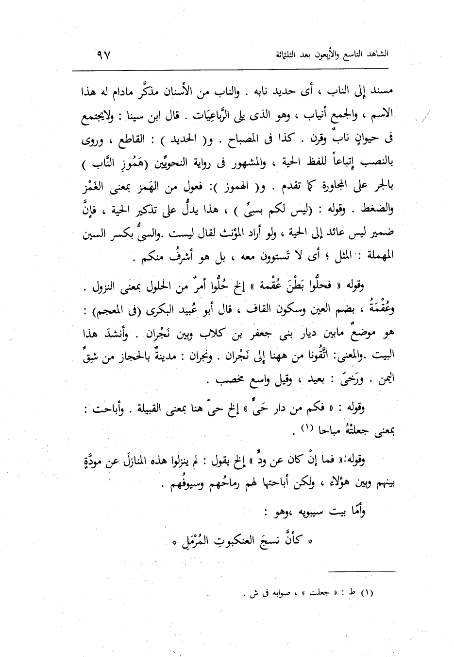 وَقَوله: فَمَا إنْ كَانَ عَن ودٍّ الخ يَقُول: لم ينزلُوا هَذِه الْمنَازل عَن مَوَدَّة بَينهم وَبَين هَؤُلَاءِ وَلَكِن أباحتها لَهُم رماحهم وَسُيُوفهمْ.)