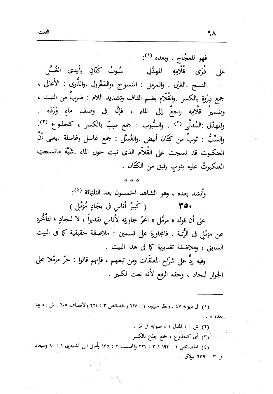 وَأنْشد بعده الشَّاهِد الْخَمْسُونَ بعد الثلاثمائة الطَّوِيل كَبِير أنَاس فِي بجاد مزمل على أَن قَوْله مزمل انجر لمجاورته ل أنَاس تَقْديرا لَا ل بجاد لتأخره عَن مزمل فِي الرُّتْبَة.