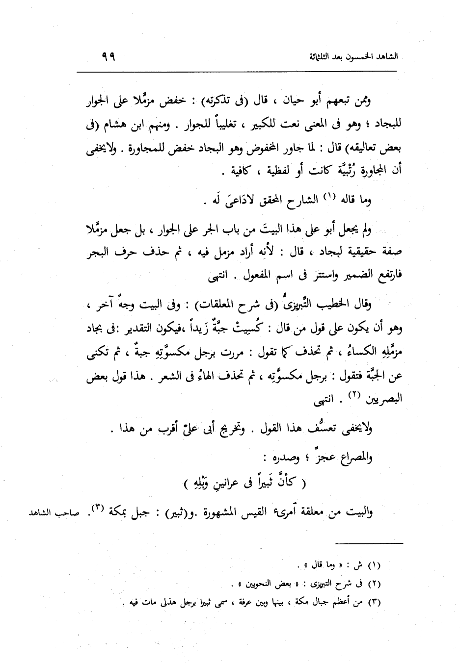 وَقَالَ الْخَطِيب التبريزي فِي شرح المعلقات: وَفِي الْبَيْت وَجه آخر وَهُوَ أَن يكون على قَول من قَالَ كُسِيت جُبَّة زيدا فَيكون التَّقْدِير: فِي بجاد مزمله الكساء ثمَّ تحذف كَمَا تَقول: مَرَرْت بِرَجُل مكسوته جُبَّة ثمَّ تكني عَن الْجُبَّة فَتَقول: مَرَرْت بِرَجُل مكسوته ثمَّ تحذف الْهَاء فِي الشّعْر. هَذَا قَول بعض الْبَصرِيين. انْتهى.
