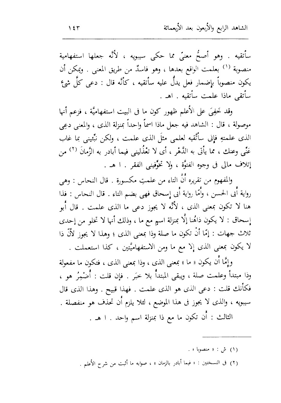 وَهُوَ أصح معنى مِمَّا حكى سِيبَوَيْهٍ لِأَنَّهُ جعلهَا استفهامية مَنْصُوبَة بعلمت الْوَاقِع بعْدهَا وَهُوَ فاسدٌ من طَرِيق الْمَعْنى. وَيُمكن أَن يكون مَنْصُوبًا بإضمار فعل يدل عَلَيْهِ سأتقيه كَأَنَّهُ قَالَ: دعِي كل شَيْء سأتقي مَاذَا علمت سأتقيه. اه. وَقد خَفِي على الأعلم ظُهُور كَون مَا فِي الْبَيْت استفهامية فَزعم أَنَّهَا مَوْصُولَة قَالَ: الشَّاهِد فِيهِ جعل مَاذَا اسْما وَاحِدًا بِمَنْزِلَة الَّذِي وَالْمعْنَى دعِي الَّذِي عَلمته فَإِنِّي سأتقيه لعلمي مثل الَّذِي علمت وَلَكِن نبئيني بِمَا غَابَ عني وعنك مِمَّا يَأْتِي بِهِ الدَّهْر أَي: لَا تعذليني فِيمَا أبادر بِهِ الزَّمَان من إِتْلَاف مَالِي فِي وُجُوه الفتوة وَلَا تخوفيني الْفقر. اه. وَالْمَفْهُوم من تَقْرِيره أَن التَّاء من علمت مَكْسُورَة. قَالَ النّحاس: وَهِي رِوَايَة أبي الْحسن وَأما رِوَايَة أبي إِسْحَاق فَهِيَ بِضَم التَّاء. قَالَ النّحاس: ف إِذا هُنَا لَا تكون بِمَعْنى الَّذِي لِأَنَّهُ لَا يجوز دعِي مَا الَّذِي علمت. قَالَ أَبُو إِسْحَاق: لَا يكون ذَا هُنَا إِلَّا بِمَنْزِلَة اسْم مَعَ مَا وَذَلِكَ أَنَّهَا لَا تَخْلُو من إِحْدَى ثَلَاث جِهَات: إِمَّا أَن تكون مَا صلَة وَذَا بِمَعْنى الَّذِي وَهَذَا لَا يجوز)
