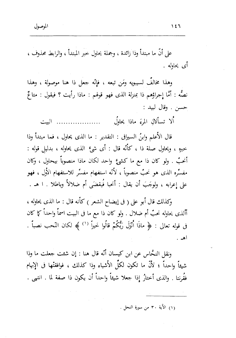 وَقَالَ لبيد: أَلا تَسْأَلَانِ الْمَرْء مَاذَا يحاول ... ... ... ... . الْبَيْت قَالَ الأعلم وَابْن السيرافي: التَّقْدِير: مَا الَّذِي يحاول ف مَا: مُبْتَدأ وذَا خَبره ويحاول: صلَة ذَا كَأَنَّهُ قَالَ: أَي شَيْء الَّذِي يحاوله بِدَلِيل قَوْله: أنحبٌ. وَلَو كَانَ ذَا مَعَ مَا كشيء وَاحِد لَكَانَ مَاذَا مَنْصُوبًا بيحاول وَكَانَ مفسره الَّذِي هُوَ نحبٌ مَنْصُوبًا لِأَنَّهُ اسْتِفْهَام مُفَسّر للاستفهام الأول فَهُوَ على إعرابه ولوجب أَن يُقَال: أنحباً فَيقْضى أم ضلالا وباطلاً. اه. وَكَذَلِكَ قَالَ أَبُو عَليّ فِي إِيضَاح الشّعْر كَأَنَّهُ قَالَ: مَا الَّذِي يحاوله أألذي يحاوله نحبٌ أم ضلال وَلَو كَانَ ذَا مَعَ مَا فِي الْبَيْت اسْما وَاحِدًا كَمَا كَانَ فِي قَوْله تَعَالَى: مَاذَا أنزل ربكُم قَالُوا خيرا لَكَانَ النحب نصبا.
