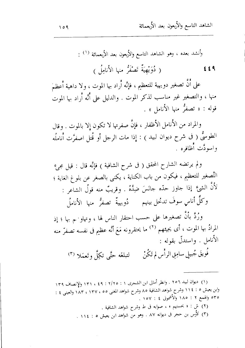 الشَّاهِد التَّاسِع وَالْأَرْبَعُونَ بعد الأربعمائة دويهية تصفر مِنْهَا الأنامل على أَن تَصْغِير دويهية للتعظيم فَإِنَّهُ أَرَادَ بهَا الْمَوْت وَلَا داهية أعظم مِنْهَا
