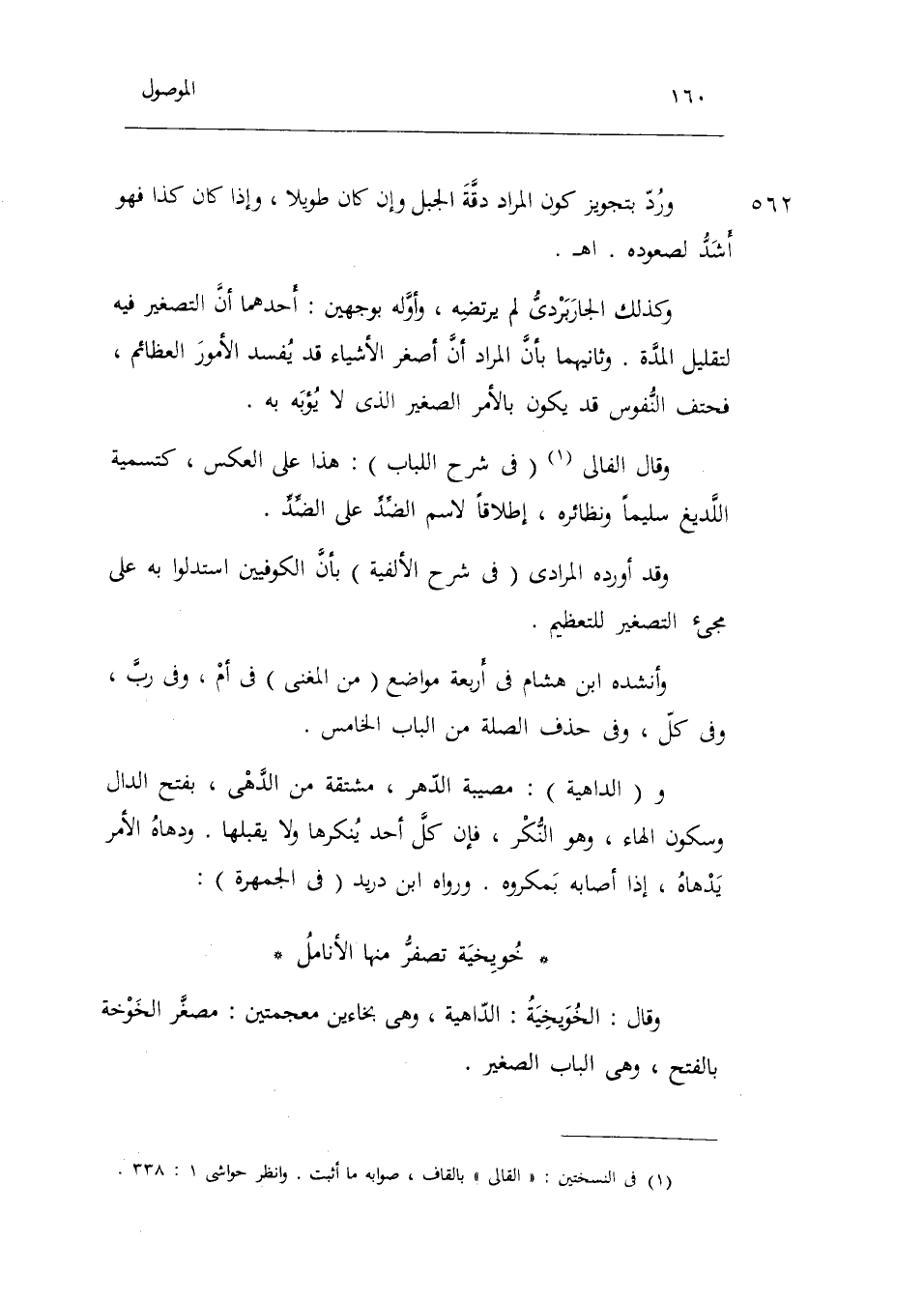 وَكَذَلِكَ الجاربردي لم يرتضه وأوله بِوَجْهَيْنِ: أَحدهمَا: أَن التصغير فِيهِ لتقليل الْمدَّة. وَثَانِيهمَا: بِأَن المُرَاد أَن أَصْغَر الْأَشْيَاء قد يفْسد الْأُمُور العظائم فحتف النُّفُوس قد يكون بِالْأَمر الصَّغِير الَّذِي لَا يؤبد بِهِ. وَقَالَ الفالي فِي شرح اللّبَاب: هَذَا على الْعَكْس كتسمية اللديغ سليما ونظائره إطلاقاً لاسم الضِّدّ على الضِّدّ. وَقد أوردهُ الْمرَادِي فِي شرح الألفية بِأَن الْكُوفِيّين استدلوا بِهِ على مَجِيء التصغير للتعظيم. وأنشده ابْن هِشَام فِي أَرْبَعَة مَوَاضِع من الْمُغنِي فِي أم وَفِي رب وَفِي كل وَفِي حذف الصِّلَة من الْبَاب الْخَامِس. والداهية: مُصِيبَة الدَّهْر مُشْتَقَّة من الدهي بِفَتْح الدَّال وَسُكُون الْهَاء وَهُوَ النكر فَإِن كل أحد ينكرها وَلَا يقبلهَا. ودهاه الْأَمر يدهاه إِذا أَصَابَهُ بمكروه. وَرَوَاهُ ابْن دُرَيْد فِي الجمهرة: خويجية تصفر مِنْهَا الأنامل وَقَالَ: الخويجية: الداهية وَهِي بخاءين معجمتين: مصغر الخوخة بِالْفَتْح وَهِي الْبَاب الصَّغِير.