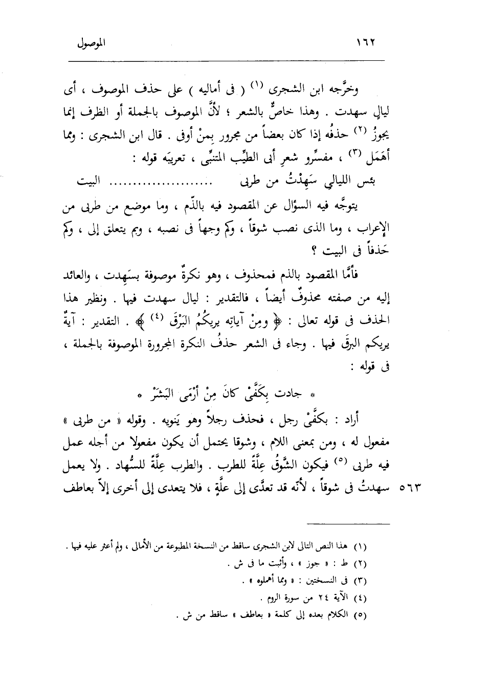 وخرجه ابْن الشجري فِي أَمَالِيهِ على حذف الْمَوْصُوف أَي: ليالٍ سهدت. وَهَذَا خَاص بالشعر لِأَن الْمَوْصُوف بِالْجُمْلَةِ أَو الظّرْف إِنَّمَا يجوز حذفه إِذا كَانَ بَعْضًا مِنْهُ مجرور ب من أَو فِي. قَالَ ابْن الشجري: وَمِمَّا أهمل مفسرو شعر أبي الطّيب المتنبي تعريبه قَوْله: بئس اللَّيَالِي سهدت من طربي ... ... ... ... . الْبَيْت يتَوَجَّه فِيهِ السُّؤَال عَن الْمَقْصُود فِيهِ بالذم وَمَا مَوضِع من طربي من الْإِعْرَاب وَمَا الَّذِي نصب شوقاً وَكم وَجها فِي نَصبه وَبِمَ يتَعَلَّق إِلَى وَكم حذفا فِي الْبَيْت