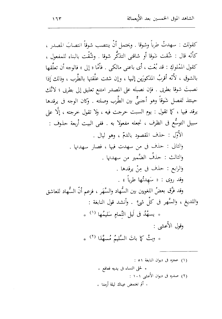 كَقَوْلِك: سهدت طَربا وشوقاً. وَيحْتَمل أَن ينْتَصب شوقاً انتصاب الْمصدر كَأَنَّهُ قَالَ: شقَّتْ شوقاً أَو شاقني التَّذَكُّر شوقاً. وَشقت بِالْبِنَاءِ للْمَفْعُول كَقَوْل الْمَمْلُوك: قد بِعْت أَي: بَاعَنِي مالكي. فَأَما إِلَى فَالْوَجْه أَن تعلقهَا بالشوق لِأَنَّهُ أقرب الْمَذْكُورين إِلَيْهَا وَإِن شِئْت علقتها بالطرب وَذَلِكَ إِذا نصبت شوقاً بطربي. فَإِن نصبته على الْمصدر امْتنع تَعْلِيق إِلَى بطربي لِأَنَّك حينئذٍ تفصل شوقاً وَهُوَ أجنبيٌّ بَين الطَّرب وصلته. وَكَانَ الْوَجْه فِي يرقدها يرقد فِيهَا كَمَا)