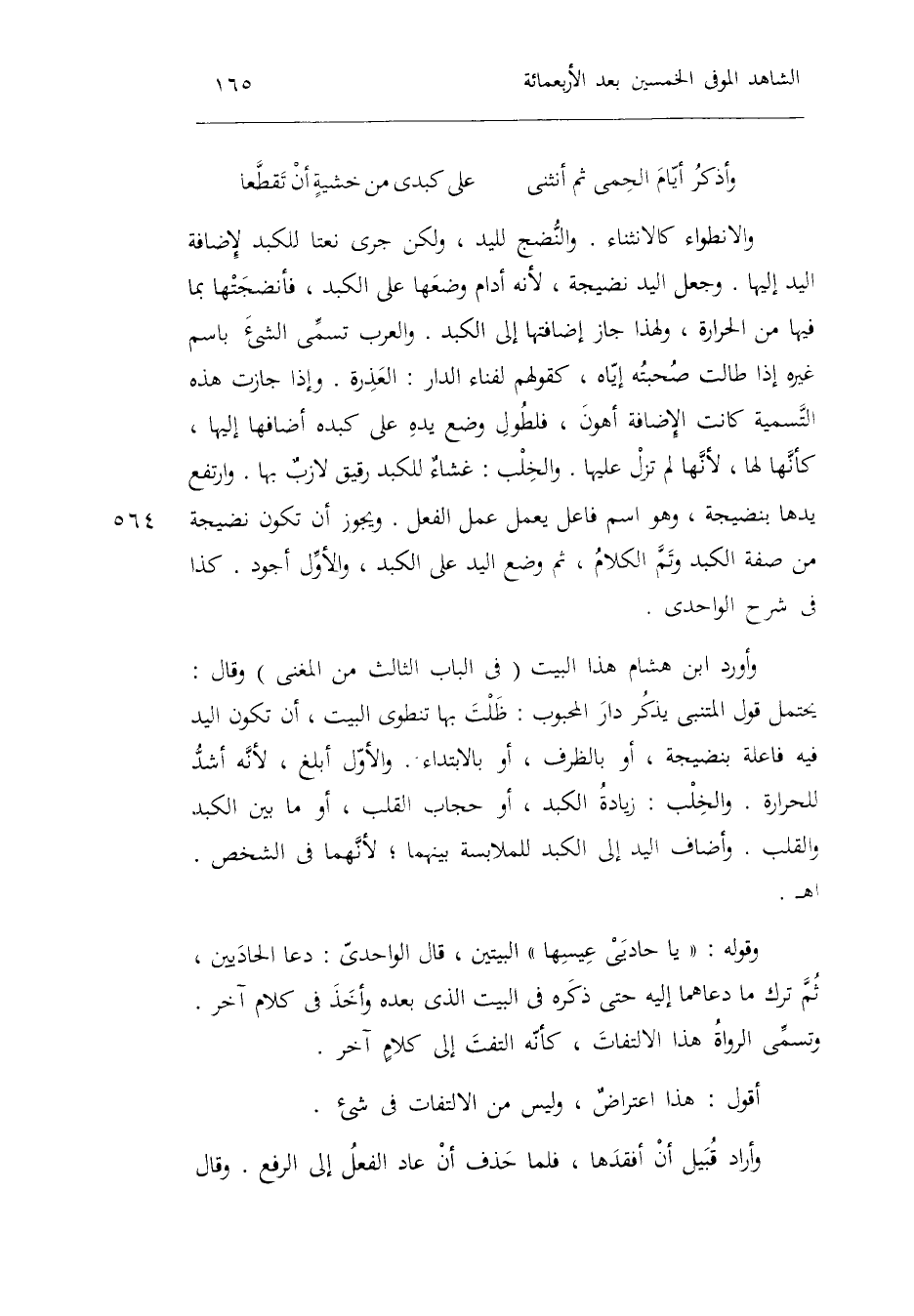 وَأورد ابْن هِشَام هَذَا الْبَيْت فِي الْبَاب الثَّالِث من الْمُغنِي وَقَالَ: يحْتَمل قَول المتنبي يذكر دَار المحبوب: ظلت بهَا تنطوي الْبَيْت أَن تكون الْيَد فِيهِ فاعلة بنضيجة أَو بالظرف أَو بِالِابْتِدَاءِ. وَالْأول أبلغ لِأَنَّهُ أَشد للحرارة. والخلب: زِيَادَة الكبد أَو حجاب الْقلب أَو مَا بَين الكبد وَالْقلب. أضَاف الْيَد إِلَى الكبد للملابسة بَينهمَا لِأَنَّهُمَا فِي الشَّخْص. اه. وَقَوله: يَا حاديي عيسها الْبَيْتَيْنِ قَالَ الواحدي: دع الحاديين ثمَّ ترك مَا دعاهما إِلَيْهِ حَتَّى ذكره فِي الْبَيْت الَّذِي بعده وَأخذ فِي كَلَام آخر. وتسمي الروَاة هَذَا الِالْتِفَات كَأَنَّهُ الْتفت إِلَى كلامٍ آخر. أَقُول: هَذَا اعتراضٌ وَلَيْسَ من الِالْتِفَات فِي شَيْء. وَأَرَادَ قبيل أَن أفقدها فَلَمَّا حذف أَن عَاد الْفِعْل إِلَى الرّفْع. وَقَالَ